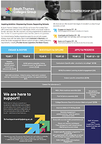 At South Thames College Group (STCG), our Schools Partnership Team (SPT) collaborates with schools to help inspire, inform and prepare students for their next steps. We offer a dynamic, evolving programme for students from Year 7 to Year 13, supporting careers leads, teachers, and parents and guardians.